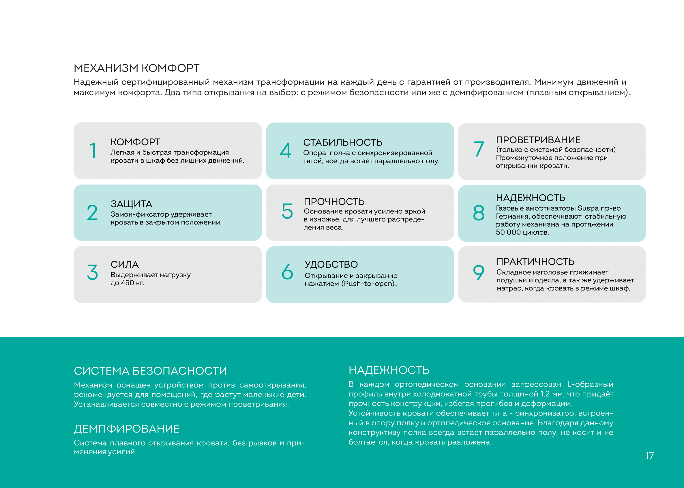 Конструкция механизма рассчитана на нагрузку до 750 кг, что обеспечивает надежность мебели при ежедневном использовании.