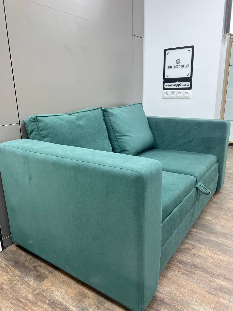 Для трансформации достаточно убрать подушки дивана и потянуть за фасад кровати. Диван автоматически выдвигается вперед и становится параллельно полу.