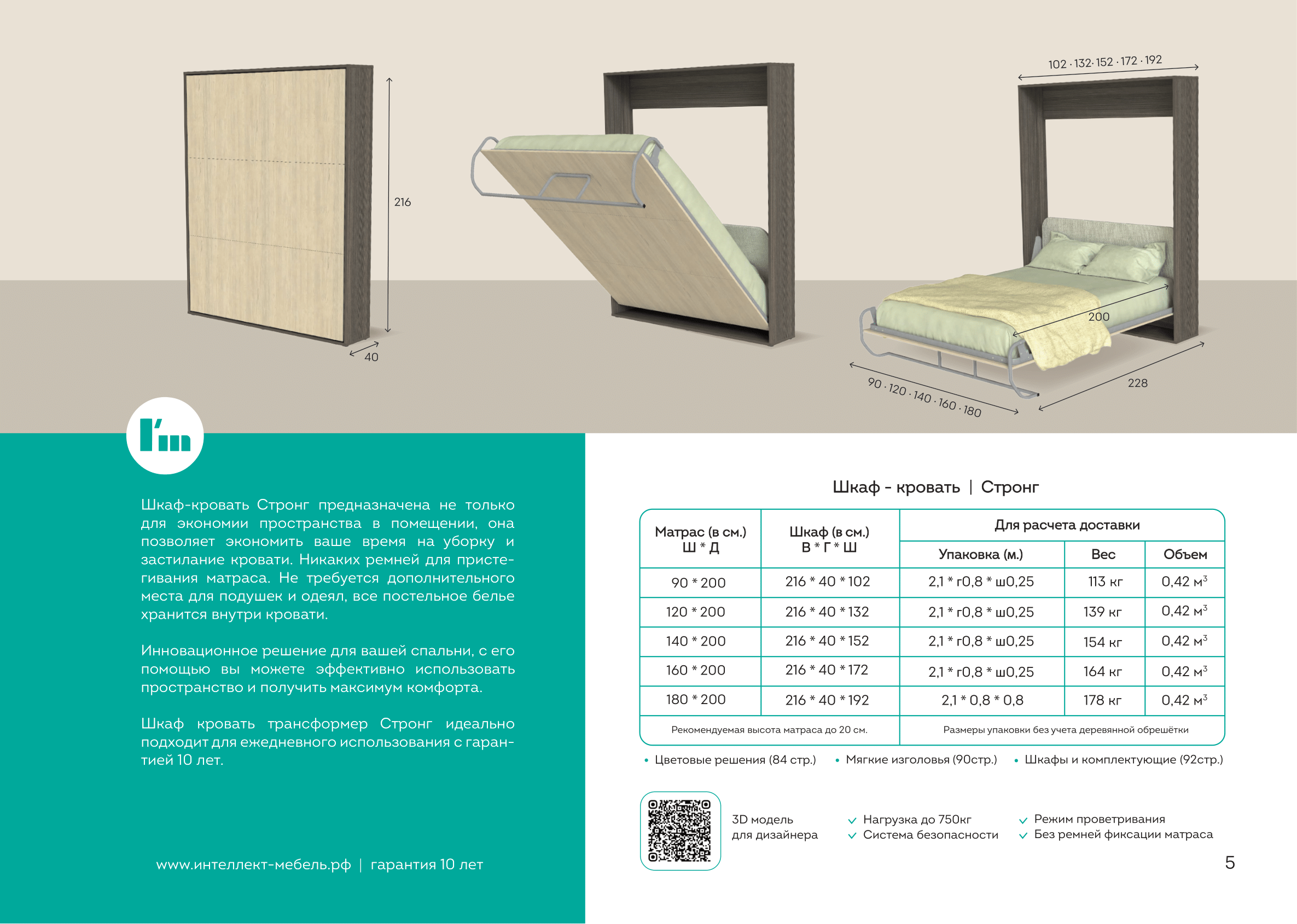 Шкаф-кровать Стронг от производственной компании Интеллект мебель— это уникальный трансформер, созданный для эффективного использования пространства в квартире, доме или студии. Благодаря инновационному механизму Стронг вы получаете максимум комфорта и безопасности при ежедневном использовании минимум 10 лет. Эта модель идеально подходит для небольших помещений, где каждый метр на счету.
